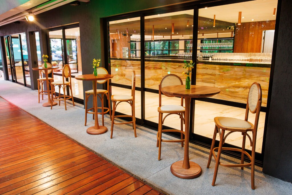 Bistrôs e banquetas são ideais para momentos de networking ou coquetel. Eles mantêm a atmosfera leve, permitem conversas rápidas e economizam espaço. Mesas maiores funcionam bem quando há jantar formal, mas mesas menores e espalhadas criam uma experiência mais solta e confortável.