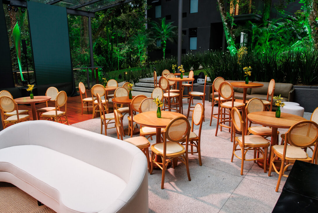 Bistrôs e banquetas são ideais para momentos de networking ou coquetel. Eles mantêm a atmosfera leve, permitem conversas rápidas e economizam espaço. Mesas maiores funcionam bem quando há jantar formal, mas mesas menores e espalhadas criam uma experiência mais solta e confortável.
